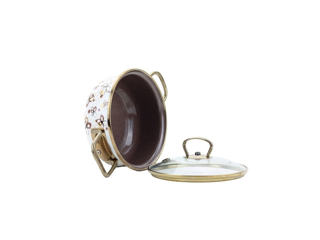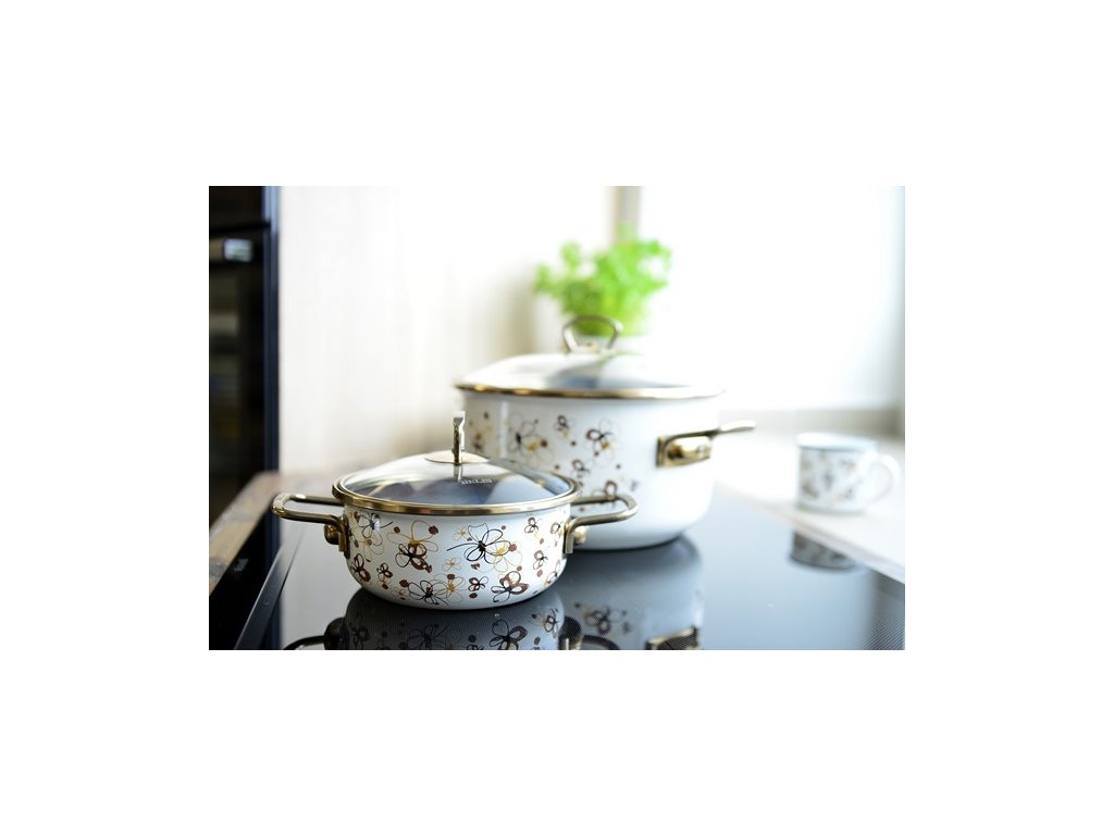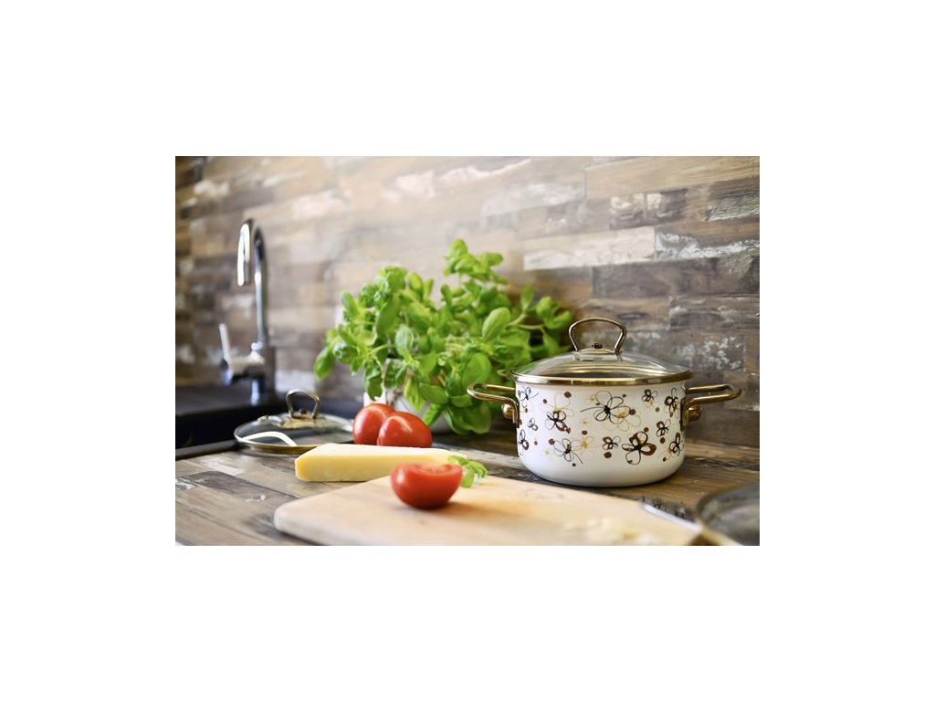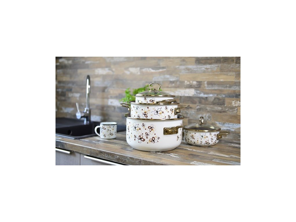 PREMIUM krémový – novinka v našem portfoliu prémiové řady smaltovaného nádobí.Jemný vzor květin přináší lehkost a úsměv a teplé krémové, hnědé a zlaté tóny zútulní interiér vaší kuchyně a poskytne jí střízlivost a solidní vzhled.Ať už máte tradiční, rustikální nebo moderní styl kuchyně, příprava pokrmů v našem nádobí vás bude vysloveně těšit!
