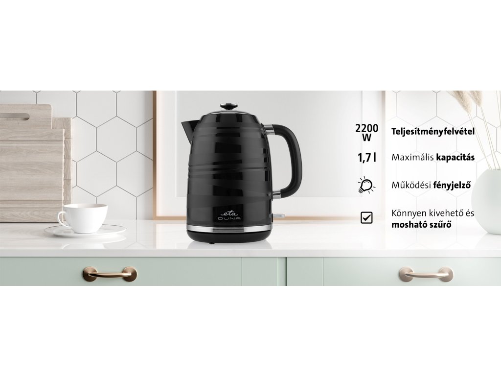 Elegantní rychlovarná konvice ETA Duna v černém provedení vás okouzlí na první pohled. Na jedno naplnění zvládne připravit až 1,7 litru vody, což je dostatek i pro 6 klasických hrnků. S vysokým příkonem 2 200 W celý proces navíc zabere opravdu chviličku. Samozřejmostí je automatické vypnutí po dosažení bodu varu.