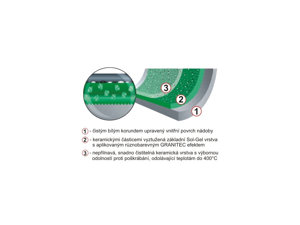 Hrnce a rendlíky s nepřilnavým černošedým povrchem vyztuženým keramickými částicemi prémiového švýcarského výrobce ILAG vydrží zátěž častého a intenzivního používání a vyznačují se dlouhodobou odolností. Nádobí má robustní tělo a přidaná keramická výztuha povrchu zvyšuje vysokou povrchovou rezistenci.