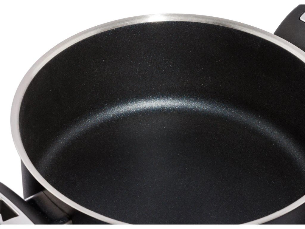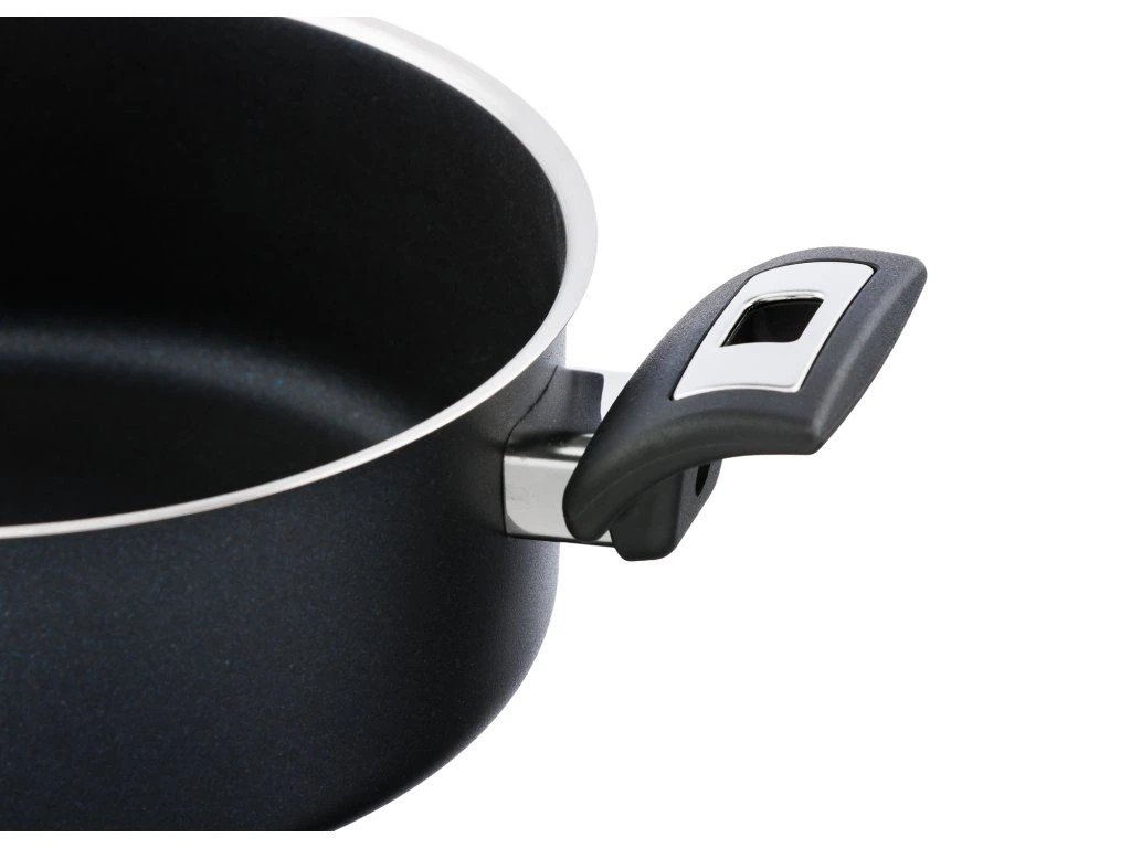 Kastrol s elegantním černým nepřilnavým povrchem PROFESSIONAL-R vyztuženým keramickými částicemi prémiového švýcarského výrobce ILAG vydrží zátěž častého a intenzivního používání a vyznačuje se dlouhodobou odolností. Tělo hrnce je robustní a přidaná keramická výztuha povrchu zvyšuje vysokou povrchovou rezistenci.