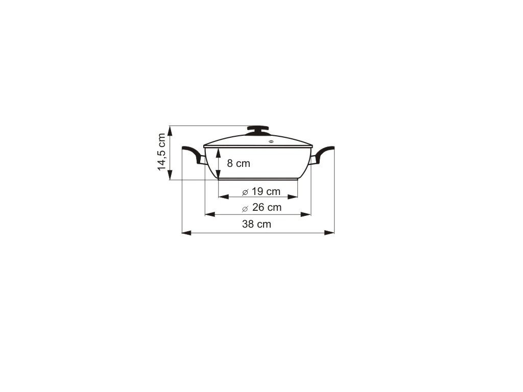- Průměr 26 cm, objem 3.4 l, výška 8 cm.