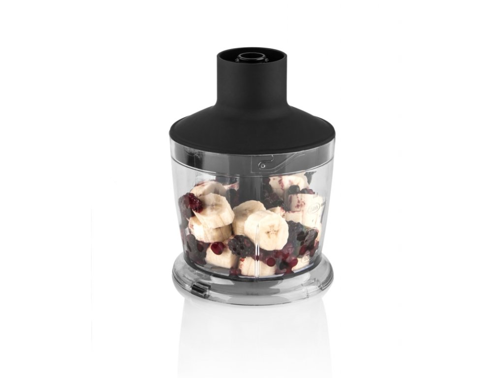 Elegantní, plastový černý mixér s nerezovými prvky se velmi dobře obsluhuje díky ergonomickému tvaru držadla. Elegantní tvar držadla s úzkými křivkami se dobře drží v ruce a neklouže, dobře se ovládá, a pomocí speciálnímu uchycení „Fast lock“ si užijete komfort v podobě jednoduchého nacvakování i vycvakování četného příslušenství, které mixér obsahuje. Všechny úkony vám půjdou jednoduše, rychle a bez práce.