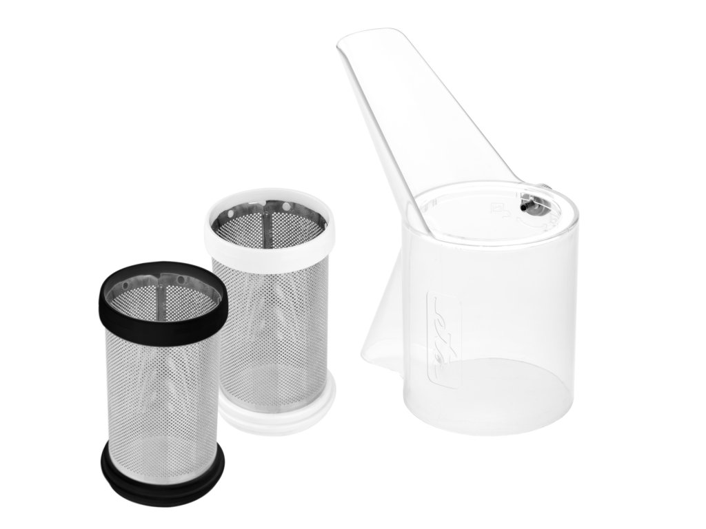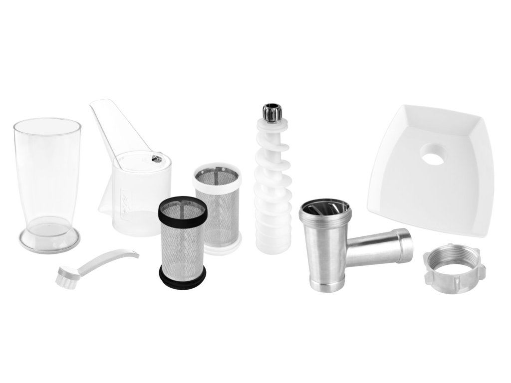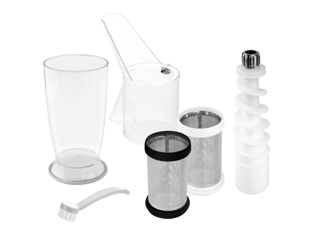 * Dvě nerezová a barevně odlišená sítka (hrubé s otvory 1 mm / jemné s otvory 0,6 mm) pro různé druhy zpracovávaných surovin s možností vícenásobného lisování dužiny, která stále obsahuje šťávu
