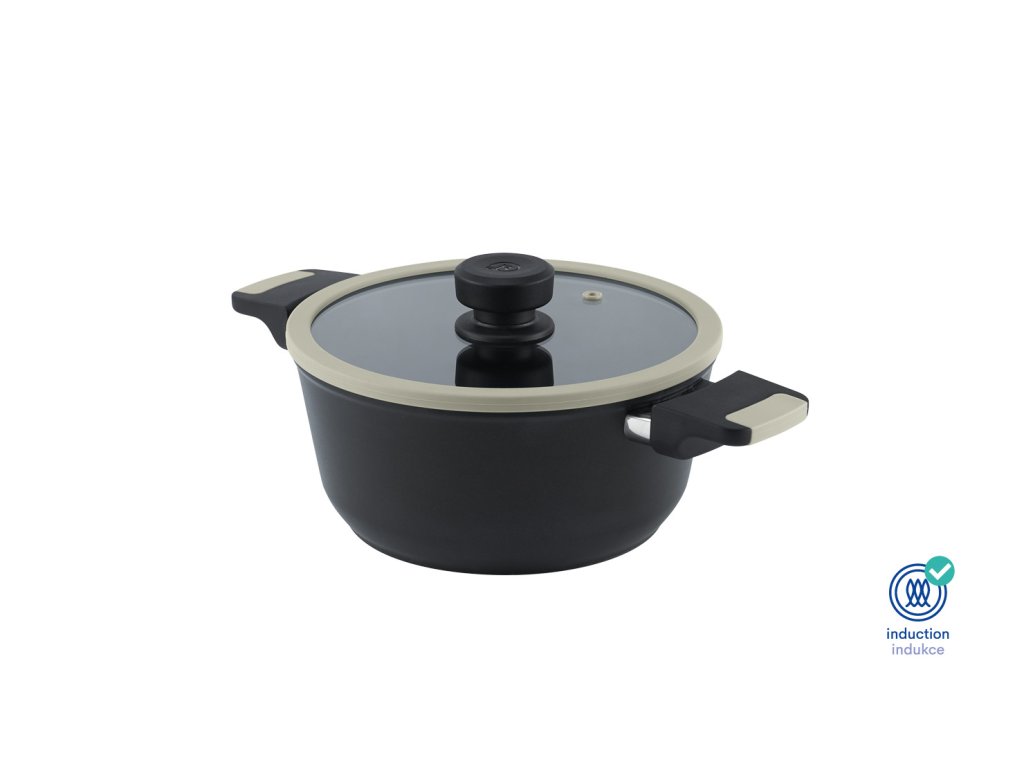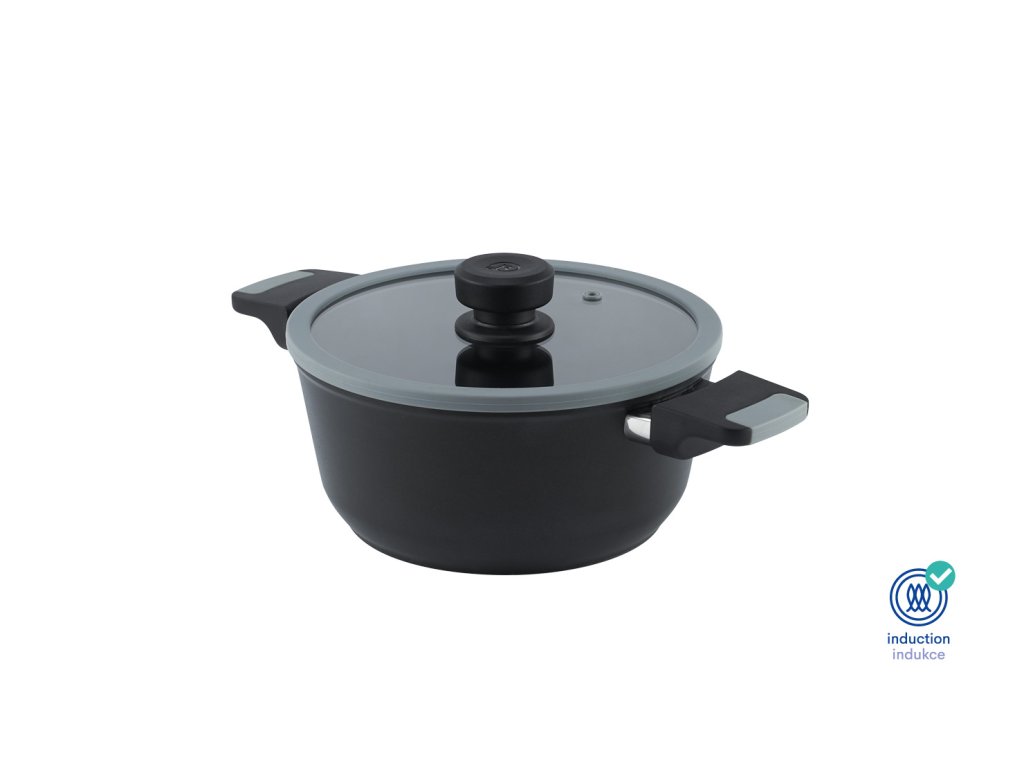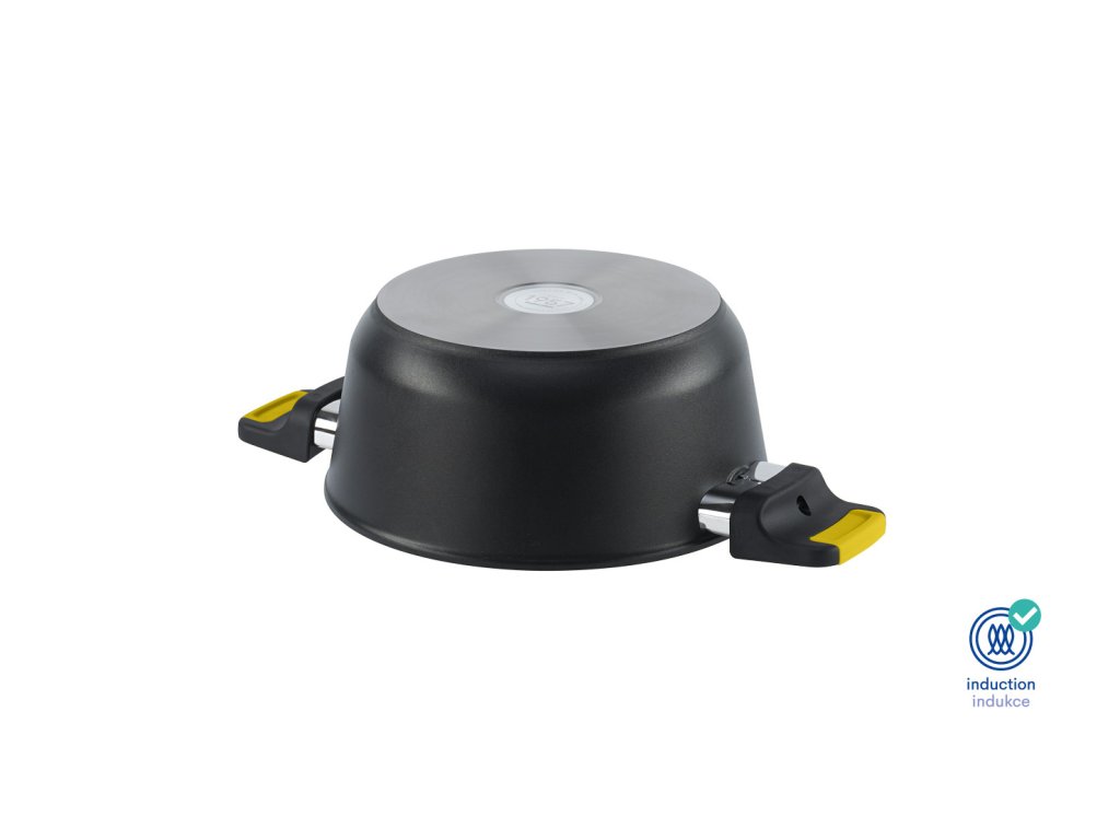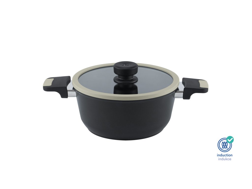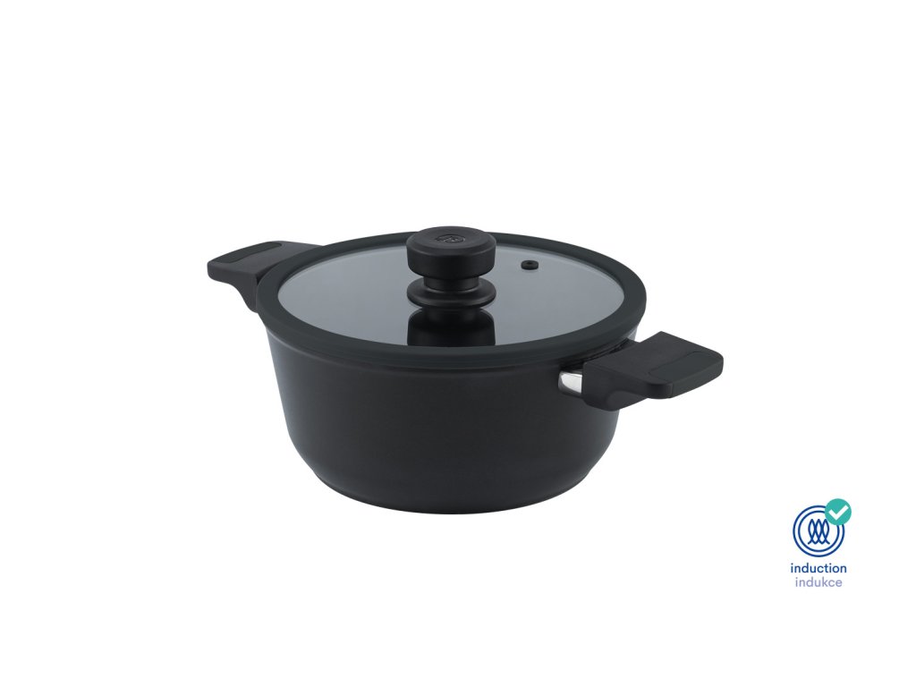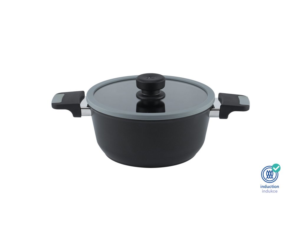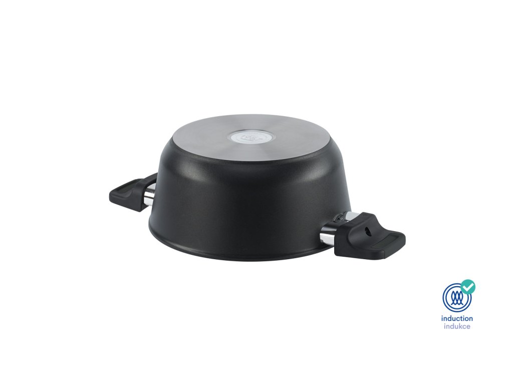Klasický hrnec vhodný na přípravu různých druhů příloh, omáček, marmelád a dalších pokrmů. Tělo hrnce je tvořeno litým hliníkem. Nepřilnavý povrch a rovnoměrný rozvod tepla celou nádobou umožňuje připravovat pokrmy bez použití tuku. Úchyty jsou vyrobeny z vysoce kvalitního materiálu, odolávajícímu teplotám až do 250°C a tím umožňují bezpečnou manipulaci a také možnost pečení v troubě. Úchyty jsou v černé barvě. Součástí balení je skleněná poklice. Speciální profil okraje poklice umožňuje vařit a péct pod stálým mírným přetlakem páry, což podporuje zdravé vaření s malým množstvím vody. Hrnec je vhodný na indukci. |