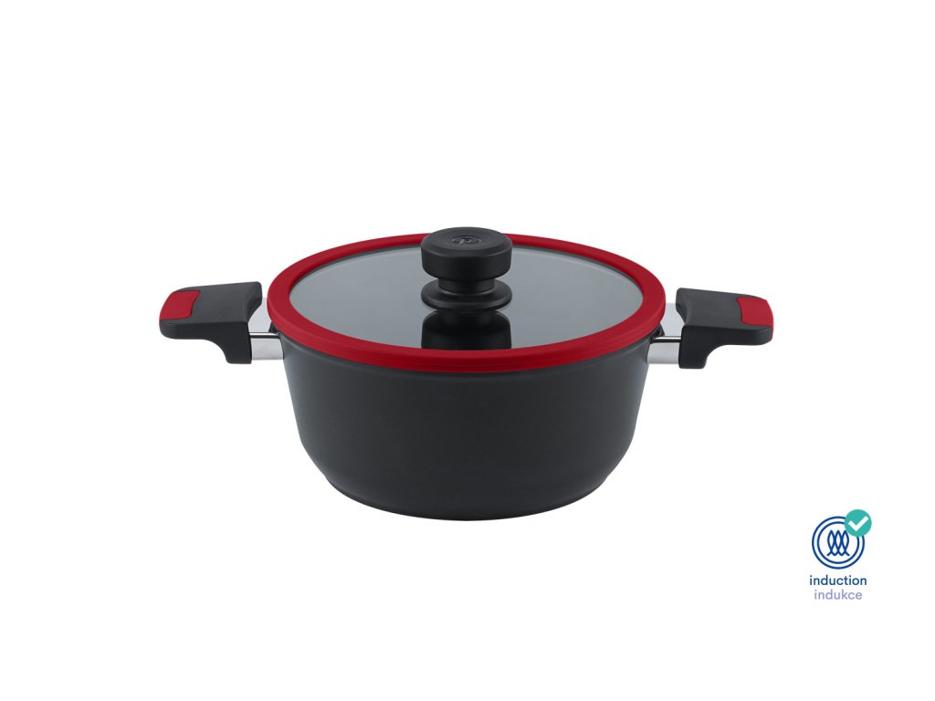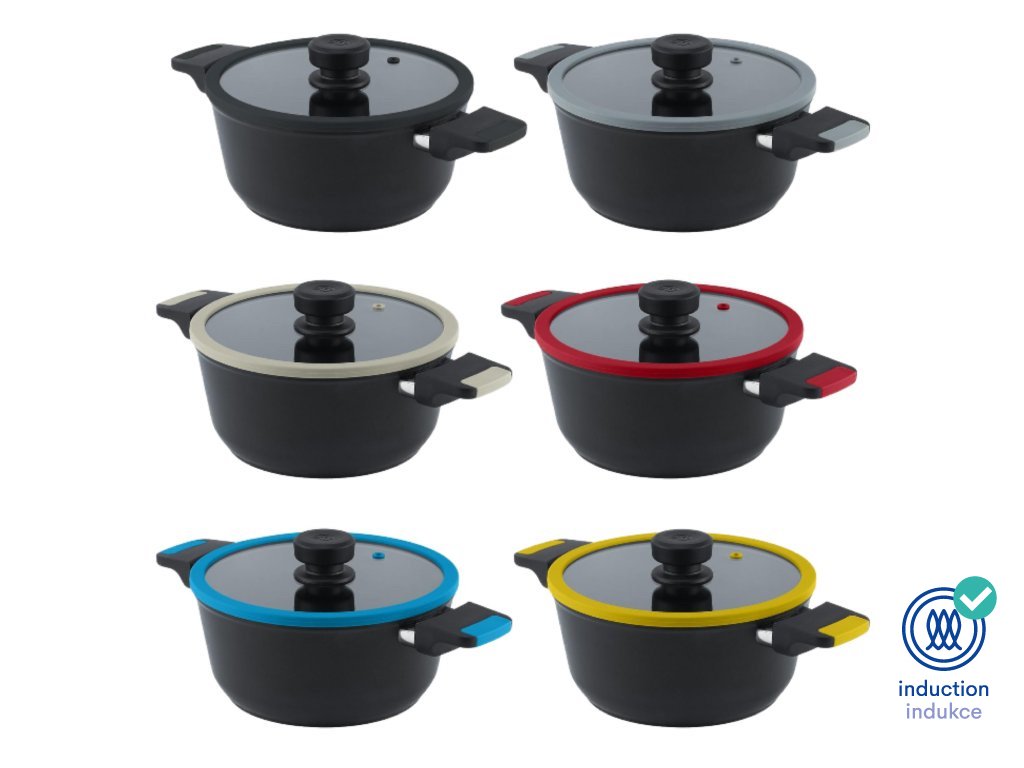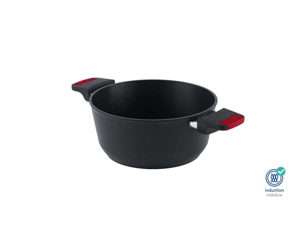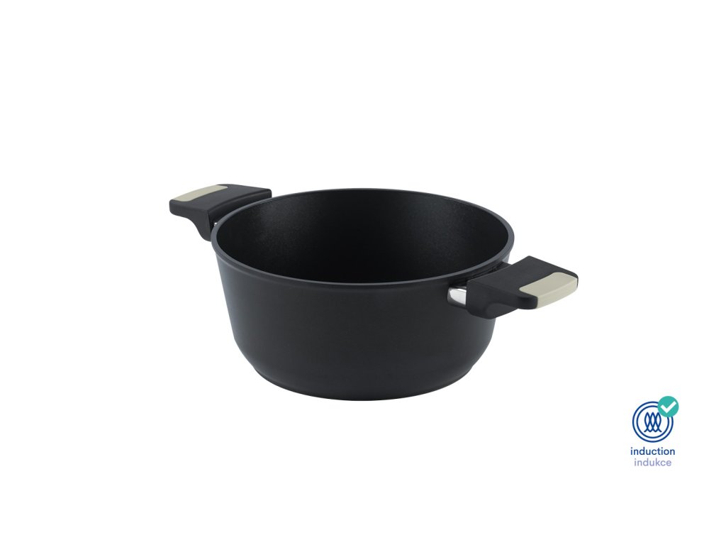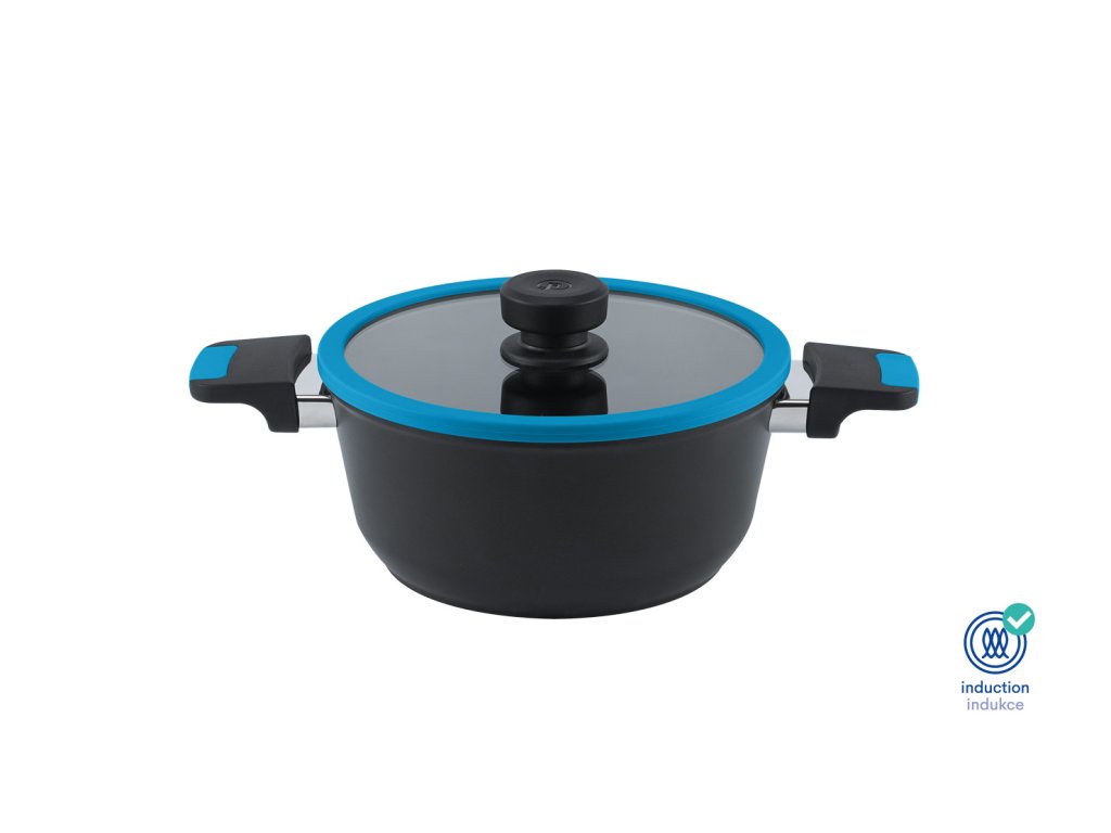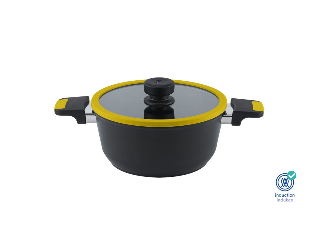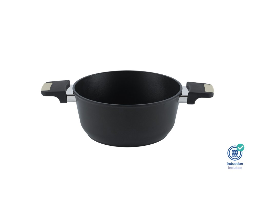 Klasický hrnec vhodný na přípravu různých druhů příloh, omáček, marmelád a dalších pokrmů. Tělo hrnce je tvořeno litým hliníkem. Nepřilnavý povrch a rovnoměrný rozvod tepla celou nádobou umožňuje připravovat pokrmy bez použití tuku. Úchyty jsou vyrobeny z vysoce kvalitního materiálu, odolávajícímu teplotám až do 250°C a tím umožňují bezpečnou manipulaci a také možnost pečení v troubě. Úchyty jsou v černé barvě. Součástí balení je skleněná poklice. Speciální profil okraje poklice umožňuje vařit a péct pod stálým mírným přetlakem páry, což podporuje zdravé vaření s malým množstvím vody. Hrnec je vhodný na indukci. |